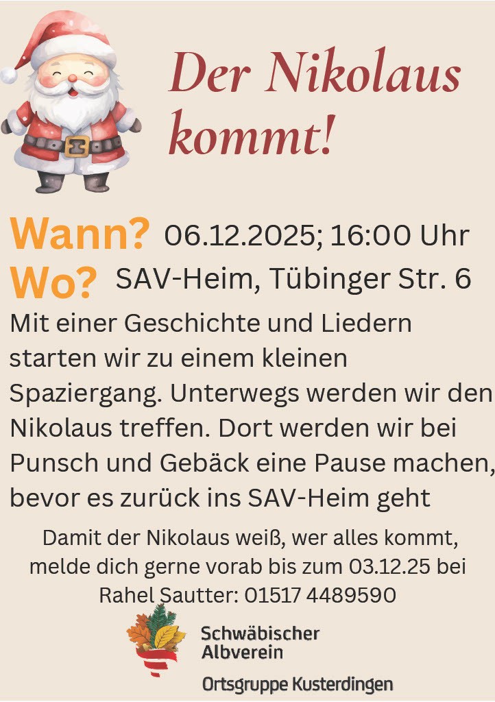 Familiengruppe: Nikolauswanderung für Groß und Klein Sa., 06.12.2025, Kusterdingen Uhrzeit: 16:00 Ort: Vereinsheim OG Kusterdingen Tübinger Straße 6 72127 Kusterdingen iCalendar Mit dem Laden der Karte akzeptieren Sie die Datenschutzerklärung von Google.Mehr erfahren Karte laden Google Maps immer entsperren zur Übersicht